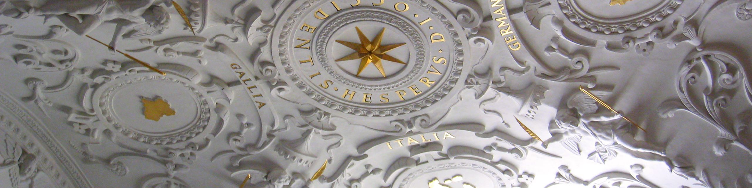 On the stucco ceiling of the chapel dedicated to St Ignatius (7), the founder of the Jesuits, he is called "Star of the Occident" radiating over Spain, Italy, Germany and France. Born 1491 in Loyola in the Basque country, Ignatius was in the service of the Spanish king until his injury in the war of Navarra (1512—1522). In a long personal journey he searched for his vocation and found the first companions to start what was to become the Society of Jesus, officially recognised by Pope Paul III in 1540. Ignatius was the first Superior General; he lived in Rome and died there in 1556.