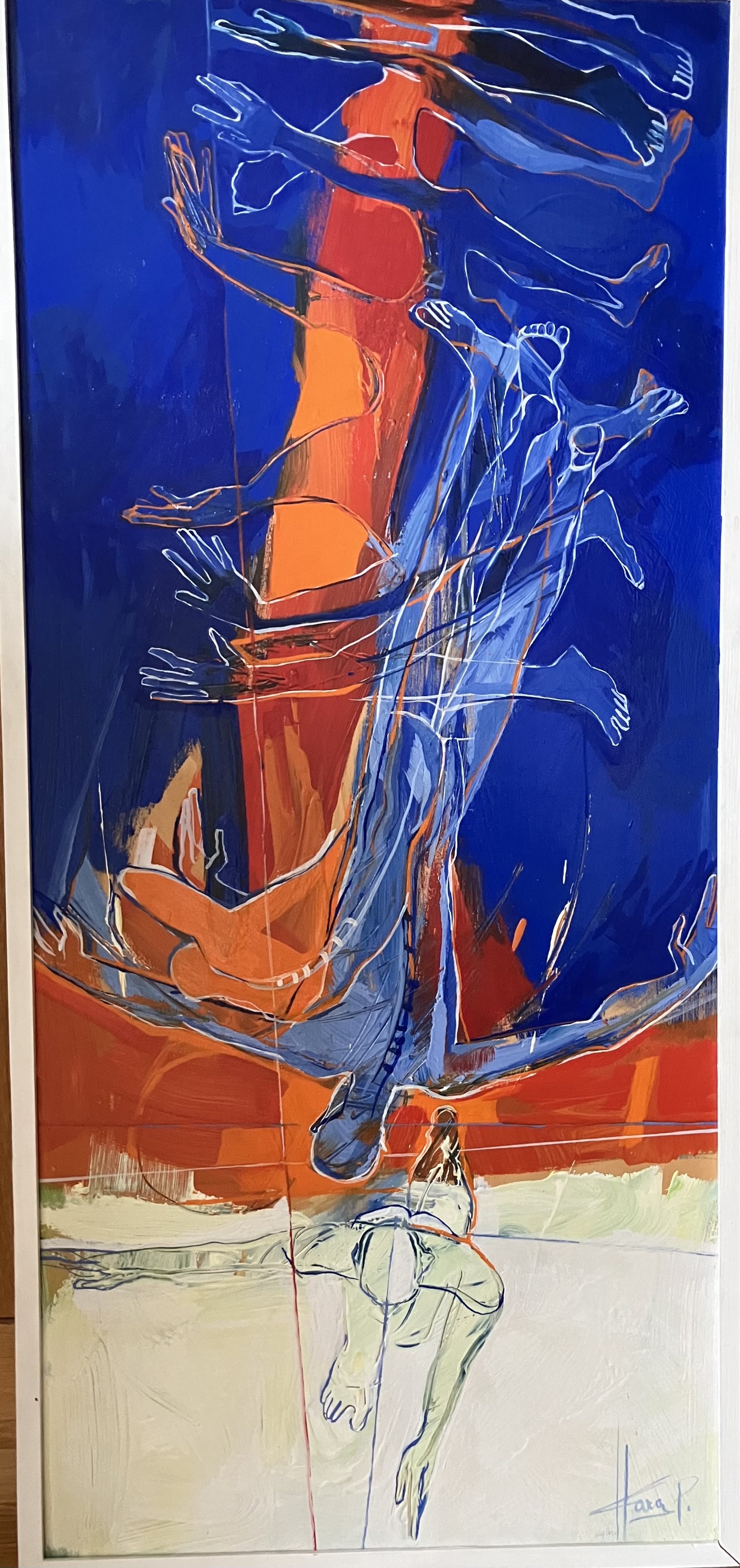 Anlässlich meiner Priesterweihe beauftragte ich die Tiroler Künstlerin Patricia Karg, ein Bild zu diesem Thema zu malen. Hier kann man es betrachten. Wir sehen Füße, die eine Richtung suchen. Wir sehen Hände, die sich an einer geraden Linie entlangtasten. Sie schneidet sich oben mit einer weiteren Linie, sodass ein rechter Winkel entsteht: ein Bild für die Wahrheit. Wir sehen eine Figur, die sich krümmt und quält. Sie öffnet sich und scheint im Blau zu schwimmen. Schließlich sehen wir eine Figur von oben. Über ihrem Scheitel ist wieder der rechte Winkel. Sie hat die Richtung gefunden und schreitet in die Weite des Lichts. In diesem Gemälde ist alles drin: Geburt und Kreuz, Tod und Auferstehung und alles dazwischen. Ein ganzes Leben.